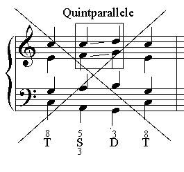 Im vierstimmigen Satz verbotenes gleichzeitiges Weiterschreiten zweier Stimmen aus einer reinen oder verminderten Quint in eine reine Quint:
